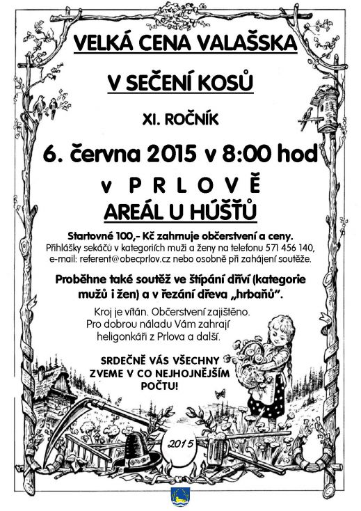V sobotu 6. 6. 2015 se v areálu "U Hůšťů" uskutečnila Velká cena Valašska v sečení kosů! Děkujeme všem, kteří se akce zúčastnili. Děkujeme za spolupráci také MS Březina Prlov, které zajistilo výborné občerstvení!